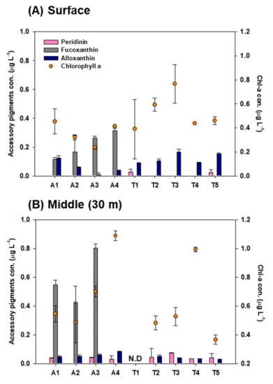 Concentration of chlorophyll a and accessory pigments of phytoplankton at (A) surface and (B) middle-layer (30 m) waters in the Kongsfjorden. The bar charts show mean concentrations ± standard deviation of pigments. N.D indicates no data.