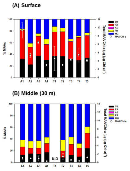 Relative contribution (%) of the different compounds to the total mycosporine-like amino acid (MAA) contents at two layers ((A) surface and (B) middle-layer water) in phytoplankton. Dots and error-bars represent the mean MAA/Chl-a and standard deviation (n = 3), respectively. SH; Shinorine, PA; Palythine, AS; Asterina-330, PR; Porphyra-334, and MG; Mycosporine-glycin. N.D indicates no data.