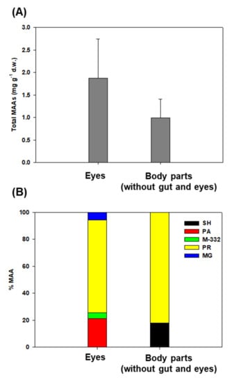 The total MAA concentration in Northern krill eyes ranged from 0.72 to 2.06 mg g−1 d.w., with a mean of 1.87 mg g−1 d.w. (SD = ±0.88 mg g−1 d.w.), which was approximately two times higher than that in the remaining dissected body parts except for the gut (0.99 ± 0.41 mg g−1 d.w., ranging from 0.52 to 1.53 mg g−1 d.w.) (Figure 3A). In addition, there was variation in the percentage composition of the MAA types between the eyes and other body parts. In detail, four different MAAs (PA, PR, MG, and unidentified MAA; M−332) were isolated from the eyes of Northern krill, whereas all other body parts, except for the gut, only contained two different kinds of MAAs (SH and PR) (Figure 3B).