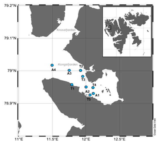 Kongsfjorden is a sub-Arctic inlet on the west coast of Spitsbergen in Svalbard, which is 26 km long and 6–14 km wide. It is a key open fjord and has a large impact on biodiversity and animal populations with physical and biological variations between the Arctic and Atlantic waters ([49] and references therein). This research was conducted onboard Teisten at nine stations (A1–A4, T1–T5) in Kongsfjorden from 22 May to 31 May 2011 (Figure 4). Sampling was conducted along two transects: transect A across Kongsfjorden from the mouth of the fjord toward the shelf (five stations: A1, A2, A3, and A4) and transect T between adjacent land stations with land-fast ice edges (five stations: T1, T2, T3, T4, and T5) (Figure 4). The mouth of the fjord is more influenced by oceanic conditions than the innermost part; the innermost part of the fjord is strongly affected by melted freshwater, sediment input, and drifting ice from glaciers.