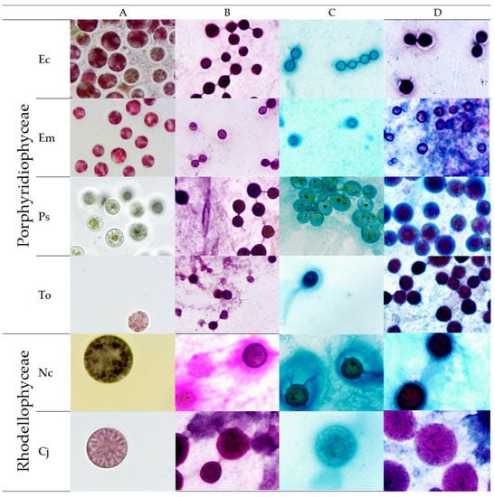 Microscopic observations of porphyridiophyceae and rhodellophyceae strains, before (A) and after staining with Schiff/periodic acid (B), alcian blue (C) and combined staining (D). Ec: Erythrolobus coxiae, Em: Erythrolobus madagascarensis, Ps: Porphyridium sordidum, To: Timspurckia oligopyrenoides, Nc: Neorhodella cyanea, Cj: Corynoplastis japonica.
