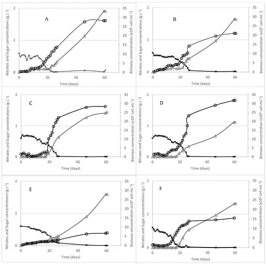 Biomass (open circles), nitrates (crosses) and extracellular sugar concentrations (triangles). (A) Porphyridium sordidum; (B) Erythrolobus madagascarensis; (C) Erythrolobus coxiae; (D) Timspurckia oligopyrenoides; (E) Corynoplastis japonica; (F) Neorhodella cyanea.