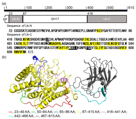 Sequence and predicted structure of VvGH17. (a) The scheme of VvGH17. SP—signal peptide; Uk-N—unknown N-terminal region; GH17—catalytic domain of GH17; Uk-C—unknown C-terminal region. Characters highlighted in yellow and those highlighted in black in the sequences are predicted α-fold and β-sheet structures, respectively. (b) Predicted three-dimensional structure. Colors are related to the truncated mutation region in this study.