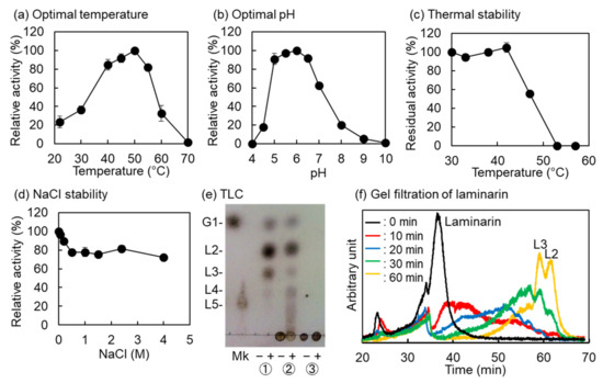 Characterization of VvGH17. (a) The effect of temperature on VvGH17 activity. The enzyme reaction was conducted in a mixture containing 50 mM MES buffer (pH 6.0), 1% (w/v) laminarin, and 0.02 mg/mL VvGH17 at 20–70 °C for 10 min. (b) The effect of pH on VvGH17 activity. The enzyme reaction was conducted in a mixture containing 1% (w/v) laminarin, 0.02 mg/mL VvGH17, and 100 mM Britton–Robinson buffer (pH 4.0–10.0) at 45 °C for 10 min. (c) The effect of temperature on VvGH17 stability. A mixture containing 50 mM MES buffer (pH 6.0) and 0.2 mg/mL VvGH17 was incubated at the indicated temperature for 30 min and placed on ice for 10 min. Then, the enzyme activity was assayed in a mixture containing 50 mM MES buffer (pH 6.0), 1% (w/v) laminarin, and 0.02 mg/mL VvGH17 at 45 °C for 10 min. (d) The effect of NaCl on VvGH17 activity. The enzyme reaction was conducted in a mixture containing 50 mM MES buffer (pH 6.0), 1% (w/v) laminarin, 0.02 mg/mL VvGH17, and 0–4.0 M NaCl at 45 °C for 10 min. (e) Thin layer chromatography (TLC) analyses of the hydrolysis products obtained using VvGH17. One microliter of each reaction mixture was applied for TLC analysis. Mk—marker of glucose and laminaripentaose; ‘−’—without VvGH17; ‘+’—with VvGH17. ①—curdlan; ②—laminarin; ③—β-glucan. (f) Gel filtration chromatography analysis for the hydrolysis of laminarin by VvGH17.