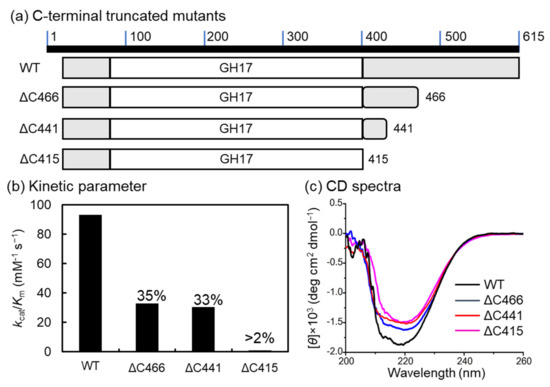 C-terminal-truncated mutants of VvGH17. (a) Scheme of C-terminal-truncated mutants. (b) Enzyme kinetics using laminarin as a substrate. The kcat/Km value of the WT (93.0 mM−1 s−1) was set at 100%, and the relative values of the other mutants are indicated in the figure. (c) CD spectra of the WT and mutants. WT—black line; ΔC466—blue line; ΔC441—red line; ΔC415—pink line.