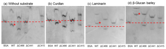 Affinity gel analysis of the WT and C-terminal-truncated mutants of VvGH17. (a) Affinity gel without substrate; (b) gel containing curdlan; (c) gel containing laminarin; (d) gel containing barley β-glucan. Asterisks show the WT monomer bands. The dashed lines show the mobility of BSA.