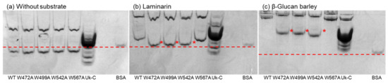 Affinity gel analysis of the WT, point mutants of VvGH17, and Uk-C. (a) Affinity gel without substrate; (b) gel containing laminarin; (c) gel containing barley β-glucan. Asterisks indicate the monomer bands showing different mobility. The dashed lines show the mobility of BSA.
