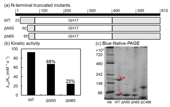 N-terminal-truncated mutants of VvGH17. (a) Scheme of N-terminal-truncated mutants. (b) Enzyme kinetics using laminarin as substrate. The kcat/Km value of the WT (93.0 mM−1 s−1) was set at 100% and the relative values of the other mutants are indicated in the figure. (c) Blue native PAGE of the WT and N- and C-terminal-truncated mutants. *—WT monomer; **—putative WT trimer from molecular weight.