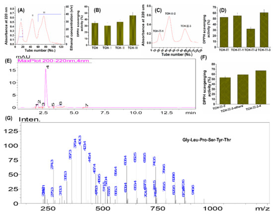 Preparation, isolation, and characterization of TCH with high antioxidant capacity. The low-molecular-weight hydrolysates in TCH were firstly isolated with SP-825 macroporous adsorption resin (A), and the hydroxyl radical scavenging activity of TCH and its three fractions was compared (B); then the fraction TCH- III with highest DPPH hydroxyl radical scavenging activity was subsequently isolated with Sephadex G-15 column (C) and fraction TCH-III-3 showed the highest activity among the three subfractions (D); next, fraction TCH-III-3 was further isolated with RP-HPLC (E) and TCH-III-3-4 exhibited the highest scavenging activity compared to other subfractions (F); eventually, the fraction TCH-III-3-4 was analyzed with LC–MS/MS, and the principal fragments were identified accordingly (G).