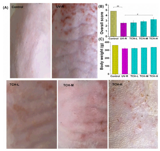 Effects of TCH administration on the physiological appearance (A), overall score (B), and body weight gains in photoaging SD rat (C). The # and ## indicate significant difference at the p < 0.05 and p < 0.01 level, respectively, when compared with that in the UV-R group.