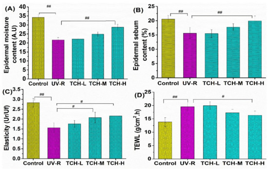 Effects of oral administration of TCH on the barrier functions in photoaging skin. (A) TCH increased the epidermal moisture content in UV-induced photoaging skin, (B) TCH increased the epidermal sebum content in UV-induced photoaging skin, (C) TCH enhanced the skin elasticity in UV-induced photoaging skin, and (D) TCH reduced the TEWL in UV-induced photoaging skin. The # and ## indicate significant differences at the p < 0.05 and p < 0.01 level, respectively, when compared with that in the UV-R group.