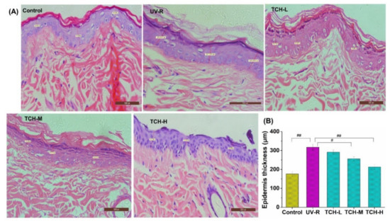 Effects of TCH administration on the histopathological abnormalities of epidermal sections in photoaging skin. (A) Representative photographs of sections by hematoxylin and eosin staining (200× magnification). (B) Effect of TCH on the epidermal thickness in photoaging skin. The # and ## indicate significant differences at the p < 0.05 and p < 0.01 level, respectively, when compared with that in the UV-R group.