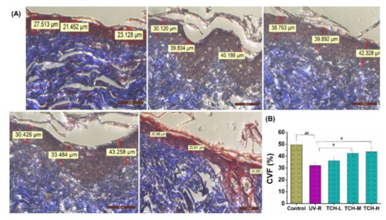 Effects of TCH administration on histopathological abnormalities of dermis sections in photoaging skin. (A) Representative photographs of sections by Masson staining (200× magnification). (B) Effect of TCH on the CVF in photoaging skin. The # and ## indicate significant differences at the p < 0.05 and p < 0.01 level, respectively, when compared with that in the UV-R group.