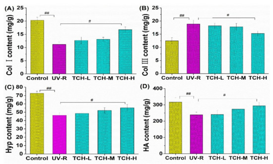 ECM is the material base for maintaining skin barrier functions, and collagen fibrils composed the principal parts of ECM. As the most abundant structural protein in skin connective tissue, collagen is responsible for providing skin with strength and resiliency [,,,]. Among the collagen fibers, Col I and III are highly associated with skin photoaging, in which Col I content negatively affects the photoaging process, whereas the content of Col III exhibits a positive effect on photoaging. As shown in Figure 6A, the Col I content significantly decreased from (22.03 ± 0.25) mg/g in the control group to (12.08 ± 0.16) mg/g in the UV-R group (p < 0.01). Compared with that in the UV-R group, the Col I content increased in a dose-dependent manner after TCH oral intervention, and the significant enhancement was found at a high dose level (p < 0.05). As for Col III, UV-R stimulated its significant high expression, and the oral administration of TCH obviously inhibited this expression (Figure 6B).