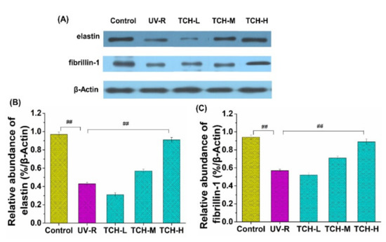 Effects of TCH on the expression levels of elastin and fibrillin-1 in the dorsal skin of SD rats. (A) Images of Western blotting of elastin and fibrillin-1 proteins. (B) Signal intensities were quantified and normalized to the corresponding value of β-actin and the quantified results of relative abundance of elastin. (C) The quantified results of relative abundance of fibrillin-1. The ## indicates significant differences at the p < 0.01 level, when compared with that in the UV-R group.