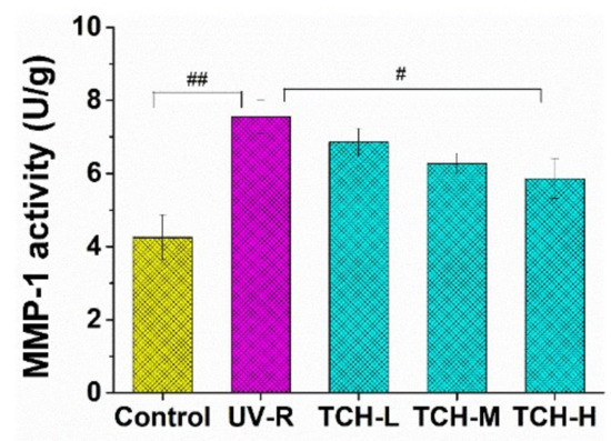 Effect of TCH administration on MMP-1 activity in photoaging skin of SD rats. The # and ## indicate significant differences at p < 0.05 and p < 0.01 level, respectively, when compared with that in UV-R group.