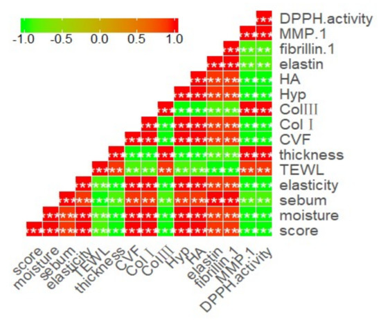 To further clarify the association of antioxidation of TCH with photoaging properties, we analyzed the correlation between DPPH activity with the determined indicators. As illustrated in Figure 9, there are significantly positive correlations between DPPH activity and the indicators of MMP-1 activity, contents of Col III, epidermal thickness, and TEWL, whilst a significant negative correlation was observed between DPPH activity and other indicators. These data strongly revealed the significance of antioxidative activity of TCH in photoaging prevention.