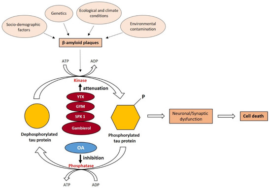The present study evidences the role of various toxins produced by marine dinoflagellates, such as yessotoxin, gymnodimine, 13-desmethyl spirolide-C, and gambierol, in AD pathology. The mechanisms of action of these toxins result in the decrease of β-amyloid plaques and hyperphosphorylation of tau proteins, as illustrated schematically in Figure 1. The ability of selected marine toxins to attenuate kinase observed in in vivo models encouraged researchers to consider the hypothesis that these toxins could be used in the therapy of AD or other neurodegenerative diseases. To validate this hypothesis, it is crucial to obtain sufficient quantities of toxins, either by chemical synthesis or by the cultivation of the producer dinoflagellate at an adequate scale. Then, clinical trials and detailed research are necessary with the select individuals suffering from various types of neurodegenerative diseases.