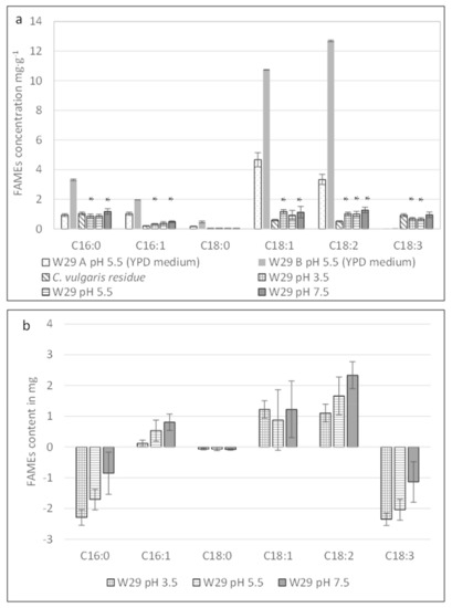 We compared the fatty acid profiles of the W29 strain after 50 h of cultivation in both media: YPD at a pH of 5.5 (yeast control) and C. vulgaris residue at different pH levels. We incubated blank C. vulgaris residue at a pH of 7.5 for 50 h to evaluate the temporal evolution of fatty acids without yeast growth. We selected this pH because of the improved substrate homogenization. Fatty acid concentrations were quantified using a gas chromatography–flame ionization detector (GC-FID). The results are shown in Figure 2a,b.