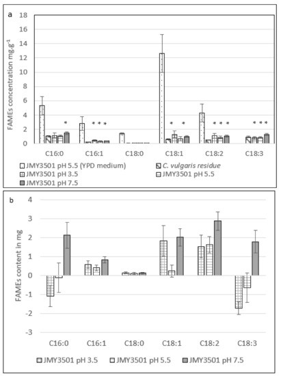 (a) Raw data on the fatty acid content of the control (C. vulgaris cultivated at a pH of 7.5) and the JMY3501 strain cultivated on YPD at a pH of 5.5 and on C. vulgaris residue media for 50 h at different pH levels. (A statistical difference was found between the initial and final concentration of fatty acids in the C. vulgaris residue; Kruskal–Wallis test, n = 4, ddl = 1, * significant at p-value < 0.05.) (b) Evolution of fatty acid quantities in the fermenter after cultivation of the JMY3501 strain in C. vulgaris residue for 50 h. These values were obtained by subtracting the initial fatty acid quantities present in C. vulgaris residue from the final fatty acid quantities present in the fermenter. (C16:0: palmitic acid; C16:1: palmitoleic acid; C18:0: stearic acid; C18:1: oleic acid; C18:2: linoleic acid; C18:3: α-linolenic acid).