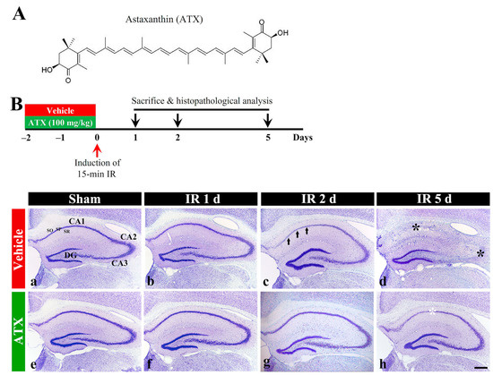 (A) The chemical structure of ATX and experimental procedure. ATX is dissolved in saline and orally administered once a day for three days before IR induction. The gerbils are sacrificed on day 1, 2 and 5 after IR; (B) Representative photographs of Nissl staining in the hippocampus (CA1-3) of the vehicle-treated (upper low) and ATX-treated (lower low) groups in sham (a,e), and on day 1 (b,f), day 2 (c,g), and day 5 (d,h) after IR. In the vehicle-IR group, CV stainability in the SP of CA1 (arrows in (c)) is pale at two days after IR, and, at five days after IR, very pale CV stainability is shown in the SP of CA1-3 (black asterisks in (d)). In the ATX-IR group, pale CV stainability is shown only in the SP of CA1 (white asterisk in (h)) at five days after IR. DG, dentate gyrus; SO, stratum oriens; SR, stratum radiatum. Scale bar = 400 μm.