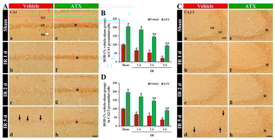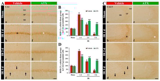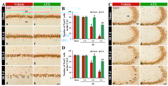 (A,C) Representative photographs of NeuN immunohistochemistry in CA1 (A) and CA2/3 (C) of the vehicle-treated (left column) and ATX-treated (right column) groups in sham (Aa,Ca,Ae,Ce), and on day 1 (Ab,Cb,Af,Cf), day 2 (Ac,Cc,Ag,Cg), and day 5 (Ad,Cd,Ah,Ch) after IR. In the vehicle-IR group, a loss of NeuN-cells (black asterisks in (Ac,Cc)) in the SP of CA1-3 is observed on day 2 after IR. At five days after IR, NeuN-pyramidal cells of CA1-3 (arrows in (Ad,Cd)) are markedly decreased; however, in the ATX-IR group, many NeuN-pyramidal cells (white asterisks in (Ah,Ch)) are shown. Scale bar = 60 µm; (B,D) Mean numbers of NeuN-pyramidal cells in CA1 (B) and CA2/3 (D). The bars indicate the means ± SEM (n = 7, respectively; * p < 0.05 vs. corresponding sham group, # p < 0.05 vs. vehicle-IR group).