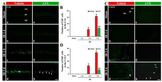 (A,C) Representative photographs of FJB staining in CA1 (A) and CA2/3 (C) of the vehicle-treated (left column) and ATX-treated (right column) groups in sham (Aa,Ca,Ae,Ce), and on day 1 (Ab,Cb,Af,Cf), day 2 (Ac,Cc,Ag,Cg), and day 5 (Ad,Cd,Ah,Ch) after IR. In the vehicle-IR group, FJB-pyramidal cells are detected in the SP of CA1-3 from two days after IR, and, at five days after IR, FJB-pyramidal cells (white asterisks in (Ad,Cd)) are significantly increased. However, in the ATX-IR group, decreased FJB-pyramidal cells (arrows in (Ah,Ch)) are observed in CA1-3 only at five days after IR. Scale bar = 60 µm; (B,D) Mean numbers of FJB- pyramidal cells in CA1 (B) and CA2/3 (D). The bars indicate the means ± SEM (n = 7, respectively; * p < 0.05 vs. corresponding sham group, # p < 0.05 vs. vehicle-IR group).