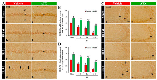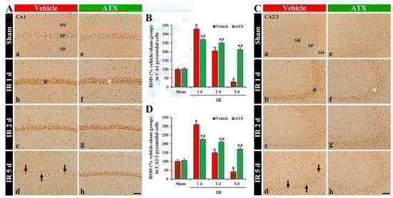 (A,C) Representative photographs of SOD1 immunohistochemistry in CA1 (A) and CA2/3 (C) of the vehicle-treated (left column) and ATX-treated (right column) groups in sham (Aa,Ca,Ae,Ce), and on day 1 (Ab,Cb,Af,Cf), day 2 (Ac,Cc,Ag,Cg), and day 5 (Ad,Cd,Ah,Ch) after IR. In the vehicle-IR group, SOD1 immunoreactivity in CA1-3 pyramidal cells is decreased with time after IR, and very low (arrows in (Ad,Cd)) on day 5 after IR. In the ATX-sham group, SOD1 immunoreactivity in CA1-3 pyramidal cells is significantly higher (asterisk in (Ae,Ce)) than in the vehicle-sham group. In the ATX-IR group, SOD1 immunoreactivity in CA1-3 pyramidal cells is decreased with time, but the immunoreactivity is significantly high (asterisks in (Af–Ah,Cf–Ch)) as compared with the vehicle-IR group. Scale bar = 60 µm; (B,D) ROD of SOD1 immunoreactivity in CA1 (B) and CA2/3 (D). The bars indicate the means ± SEM (n = 7, respectively; * p < 0.05 vs. corresponding sham group, # p < 0.05 vs. vehicle-IR group).