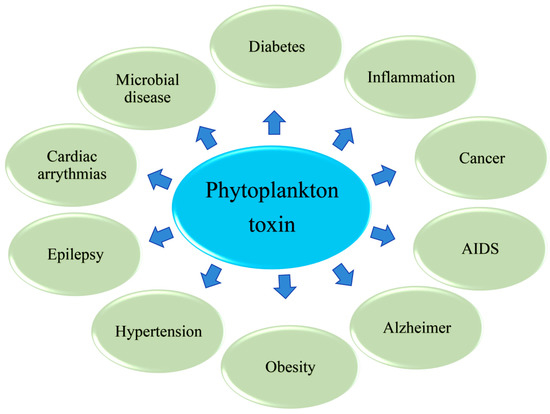 Many phytoplankton species produce compounds that are poisonous to humans, which is why they are called “toxic microalgae”. Phytoplankton toxins have a variety of chemical structures, ranging from relatively simple alkaloids and amino acids to polyketides. Polyketides belong to a family of extremely diverse compounds in terms of structure and potential biological properties. However, the evolution and functional therapeutic relevance of these secondary metabolites remains unknown. Therefore, this review focuses on the effects of toxins and their crucial roles in disease prevention. Phytoplankton toxins that modulate different diseases in humans are displayed in Figure 1.