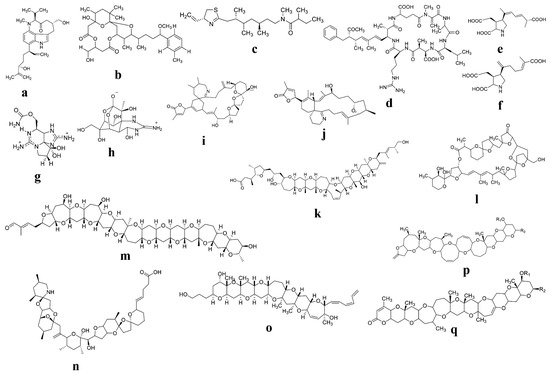 Molecular structure of various phytoplankton-derived toxins with potential therapeutic effects: (a) Lyngbyatoxin; (b) Oscillatoxins; (c) Kalkitoxin; (d) Microcystin; (e) Domoic acid; (f) Iso-domoic acid; (g) Saxitoxin (STX); (h) Tetrodotoxin (TTX); (i) gymnodimines A (GYMA); (j) 13-desmethyl spirolide C; (k) Ciguatoxin; (l) Pectenotoxin; (m) gymnocin-A (GYMA; (n) Azaspiracid-1 (AZA1); (o) Gambierol; (p) Brevetoxin type-A; (q) Brevetoxin type-B.