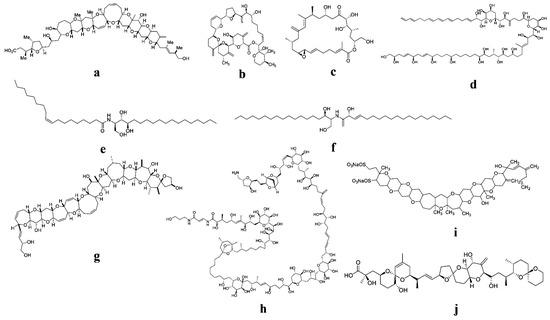 Molecular structure of various phytoplankton-derived bioactive compounds and toxins with potential therapeutic effects: (a) Gambieric acid; (b) Goniodomin-A; (c) Amphidinolide-H; (d) Amphidinol-3 (AM3); (e) Ceramide; (f) Symbioramide; (g) Ciguatoxin; (h) Palytoxin; (i) Yessotoxin; (j) Okadaic acid.