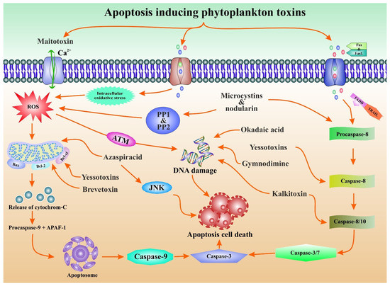 Apoptosis modulation by phytoplankton toxin in cancer prevention. Phytoplankton toxins such as azaspiracid, yessotoxins, and brevetoxins cause intracellular oxidative stress, which leads to mitochondrial dysfunction and downregulates the expression of anti-apoptotic proteins Bcl-xl and Bcl-2. Similarly, they enhance Bax expression to aid apoptosis via release of cytochrome-C, which triggers the formation of apoptosomes, leading to caspase 9 and 3 being induced and displaying apoptotic cell death. Microcystins and nodularin trigger the induction of caspase and display caspase-dependent apoptotic cell death. Moreover, microcystins and nodularin inactivate PP1 and PP2, which leads to excessive ROS. Excessive ROS enters into the ATM signaling pathways, which leads to DNA damage and displays apoptotic cell death. In addition, yessotoxins, gymnodimine, kalkitoxin, and okadaic acid trigger DNA damage, leading to apoptotic cell death. Kalkitoxin also induced the activation of caspase 8/10 and caspase 3/7, displaying caspase-dependent apoptotic cell death. Moreover, Azaspiracid entered into the JNK pathway and displayed apoptotic cell death.