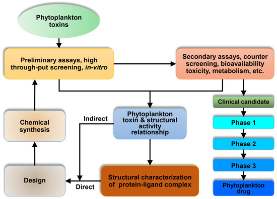 A proposed model for phytoplankton toxin as a future drug molecule. Toxins involve the identification of screening and optimization to increase the affinity through preliminary assays, high throughput screening, and in vitro screening. After successful screening, the phytoplankton toxin enters secondary assays, counter screening, bioavailability, toxicity, metabolism, etc. Then, screening of the phytoplankton toxin and its structural activity relationship can be performed through structural characterization of the protein–ligand complex. After conformation, it enters into modelling and designing of the toxin. Then, it enters into the chemical synthesis, which is more required for the clinical test. After the successful clinical phase is over, the phytoplankton toxin can be used as a drug.