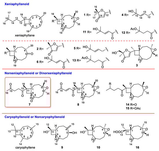 Structures of compounds 1–16, xeniaphyllane, and caryophyllene.