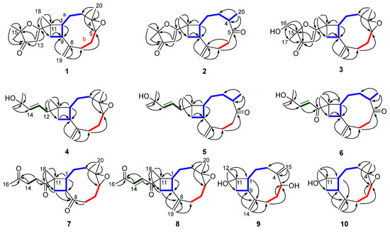 Selected 1H–1H COSY (bold lines) and key HMBC (single arrows) correlations of 1–10. Fragments a (blue) and b (red) represent two different spin systems, respectively.