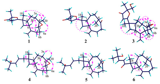 Key NOESY correlations of compounds 1–6.