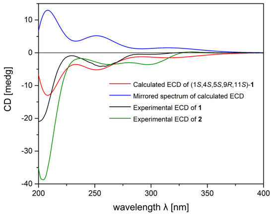 Experimental ECD spectrum of 1 (black) and 2 (green); calculated ECD spectrum of (1S,4S,5S,9R,11S)-1 (red) and its enantiomer (blue).