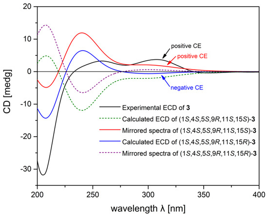 Experimental ECD spectra of 3 (black), calculated ECD spectrum of (1S,4S,5S,9R,11S,15S)-3 (dashed green), mirrored spectra of (1S,4S,5S,9R,11S,15S)-3 (red), calculated ECD spectrum of (1S,4S,5S,9R,11S,15R)-3 (blue), and mirrored spectra of (1S,4S,5S,9R,11S,15R)-3 (dashed purple).