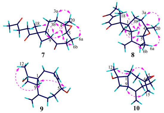 Key NOESY correlations of compounds 7–10.