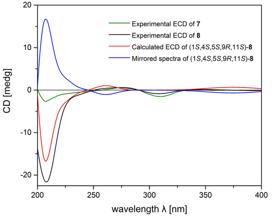 Experimental ECD spectra of 7 (green), 8 (black), calculated ECD spectrum of (1S,4S,5S,9R,11S)-8 (red), and mirrored spectra of (1S,4S,5S,9R,11S)-8 (blue).