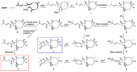 Sinuhirtone A (7) features the first 17,19-dinorxeniaphyllane skeleton, and sinuhirfuranones A–C (1–3) possess the rare 2,2-dimethylfuran-3-one group, which are structurally different from other xeniaphyllanoids. However, they do share the same 4/9 bicyclic ring system, indicating that they should be biosynthetic related. Therefore, a plausible biosynthetic connection between 1 and 9 was proposed. As shown in Scheme 1, geranylgeranyl pyrophosphate (GGPP) could be envisaged as an early linear diterpene precursor to form the xeniaphyllane-type skeleton (i) under double-bond migration and ring closure steps, while new compounds were generated after a series of different reactions, including epoxidation, allylic oxidation, elimination, double-bond oxidation, and/or reduction, and so on.