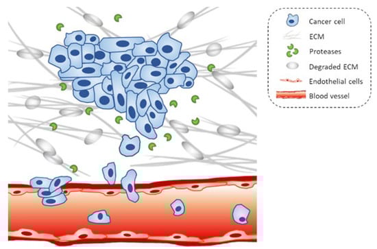 Metastasis originates from the spread of tumor cells into tissues and organs beyond their primary site and their establishment at secondary sites with the formation of new tumors []. The first step in the metastatic process is the migration of cancer cells through the extracellular matrix (ECM) of the surrounding tissue and penetration into the lymphatic or vascular circulation. After the extravasation process through the basement membrane of the vessels, the invasive cells will attach to a new site and proliferate to produce the secondary tumor [] (Figure 1).