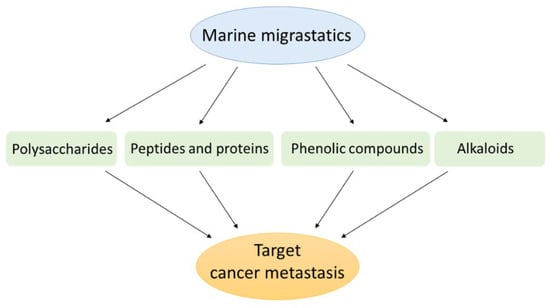 For years, researchers and experts have navigated the molecular treasures of the sea to search for and identify structurally novel and biologically active metabolites of natural products. The following sections review the last five years of research on new or known marine compounds for which a migrastatic role has been described and then proposed to the scientific community as potential agents for cancer therapy. As reported in Figure 2, the discussed bioactive marine compounds belong to several categories, namely polysaccharides, peptides and proteins, phenolic compounds, and alkaloids.