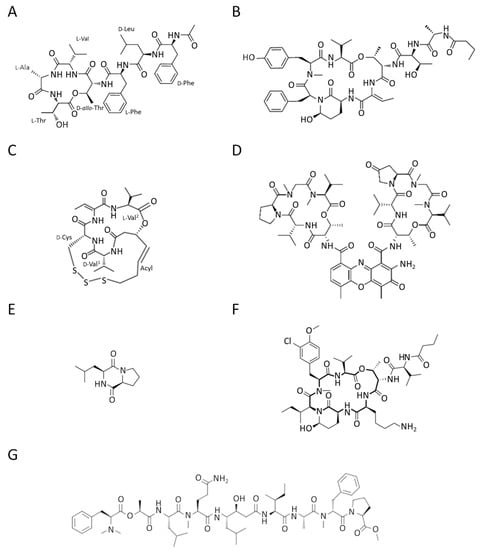Chemical structure of (A) nobilamide I from the bacterium Saccharomonospora sp., strain CNQ-490; (B) molassamide from the Cyanobacterium DRTO-73; (C) chromopeptide A from the bacterium Chromobacterium sp. HS-13-94; (D) actinomycin V from Streptomyces sp.; (E) cyclo(L-leucyl-L-prolyl from marine microorganisms; (F) kempopeptin C from the cyanobacterium Lyngbya sp., (G) grassystatin F from the Cyanobacterium VPG 14-61.