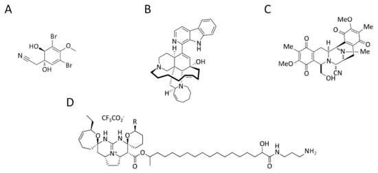 Chemical structure of (A) aeroplysinin-1 from the marine sponge A. aerophoba; (B) manzamine A from the sponge of the genera Haliclona sp., Xestospongia sp. and Pellina sp.; (C) jorunnamycin A from the sponge Xestospongia sp.; (D) normonanchocidines G (R=CH3) and H (R=H) from the marine sponge M. pulchra.