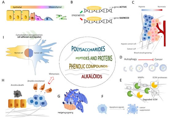 In addition, the hydroalcoholic extract obtained from the marine plant Posidonia oceanica was found to be a rich reservoir of phenolic compounds, including catechin, epicatechin, gallic acid, ferulic acid, and chlorogenic acid. This has been shown to inhibit the migration of human fibrosarcoma HT1080 cells [] and human neuroblastoma SH-SY5Y cells [] by acting on MMPs and activating autophagy. Furthermore, the polyphenol-rich phytocomplex is suitable for use as a vehicle in nanoformulations that can improve bioavailability and its migrastatic bioactivity [].