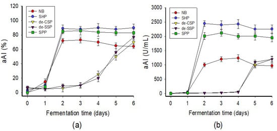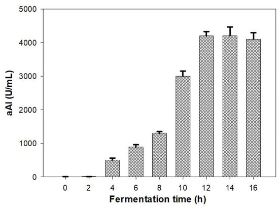 The optimal culture conditions investigated in the aforementioned experiments were applied to scale up the production of aAIs in a 14 L-bioreactor system (the 14 L BioFlo/CelliGen 115 bioreactor system—Eppendorf North America, Enfield, Connecticut, CT, USA). First, 500 mL bacterial seeds were pre-incubated in 250 mL flasks at 30 °C for two days and then transferred to the fermenter with 4.5 L of medium containing 1.5% SHP, 0.1% K2HPO4 and 0.05% MgSO4·7H2O, with an initial pH of 7. Fermentation was performed at 2.75 °C at a shaking speed of 150 rpm, with a dissolved oxygen content of 1.0 vvm for 16 h. Sampling was done every 2 h. The supernatant was harvested by centrifugation of the sample at 12,000 rpm for 10 min, and was used to detect aAI activity.