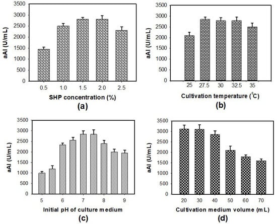 To achieve higher aAI productivity, some culture conditions were tested. A 30 mL liquid medium in a 100 mL-Erlenmeyer flask containing different concentrations of SHP (0.5, 1, 1.5, 2, and 2.5%), 0.1% K2HPO4, and 0.05% MgSO4·7H2O was fermented by P.s aeruginosa TUN03 at 30 °C with a shaking speed of 150 rpm. The activity of the supernatant was tested after two days of fermentation. SHP (1.5%) was chosen for further experimentation to investigate the effect of culture temperature (25, 27.5, 30, 32.5, and 35 °C), the initial pH of the culture medium (5, 5.5, 6, 6.5, 7, 7.5, 8, 8.5, and 9), and cultivation medium volume (20, 30, 40, 50, 60, and 70 mL). The following experiments were designed based on the optimal conditions achieved in previous experiments.