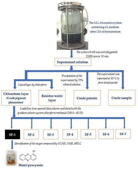Phenazine compounds are produced in significant quantities by P. aeruginosa. Thus, these compounds may play an important role in the bioactivities of P. aeruginosa. We found that the density of these pigments seemed to increase along with aAI production during P. aeruginosa TUN03 fermentation. On the other hand, earlier studies reported microbial aAIs as proteins [51,52]. Thus, to quickly predict the most active component, the supernatant was used to prepare some samples, including the crude pigment phenazines (the chloroform layer, named CPP), the residue water layer (named RWL), the crude protein (the supernatant was precipitated by ethanol, named CP) and the crude sample (the supernatant was vaporized to dried powder, named CS) to evaluate the inhibitory activity of α-amylase. The processes of preparation, purification, and identification of the target compounds are summarized in Figure 4.