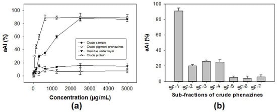 The bioactivity-guided purification process of α-amylase inhibitor compound. The α-amylase inhibitory activity of some major portions extracted from a crude sample tested at various concentrations (a) and sub-fractions of the crude pigment phenazine portion tested at a concentration of 150 µg/mL (b).